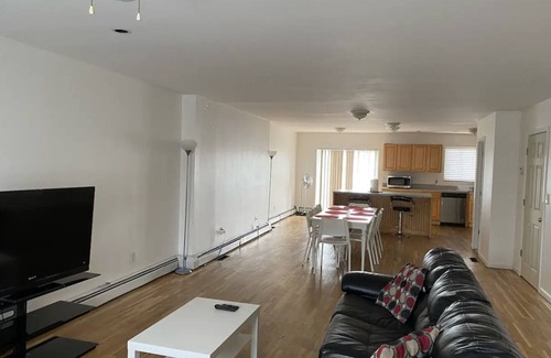 Waterfront home on Eastchester Bay, 2nd and 3rd floors, modern, 3 bedrooms with one king bed, 2 queen beds plus queen sofa bed, 2 full bathrooms and one-half bath, window AC, gas range, microwave, and refrigerator.